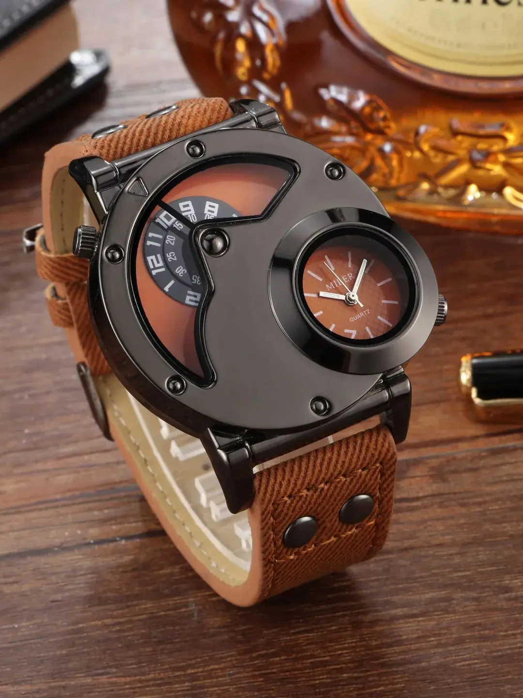 Luxury Men's Quartz Watch - Large Dual Dial Numerals, with Blue or Black Bronze Faux Leather Strap, Alloy Case, Non-Waterproof,
